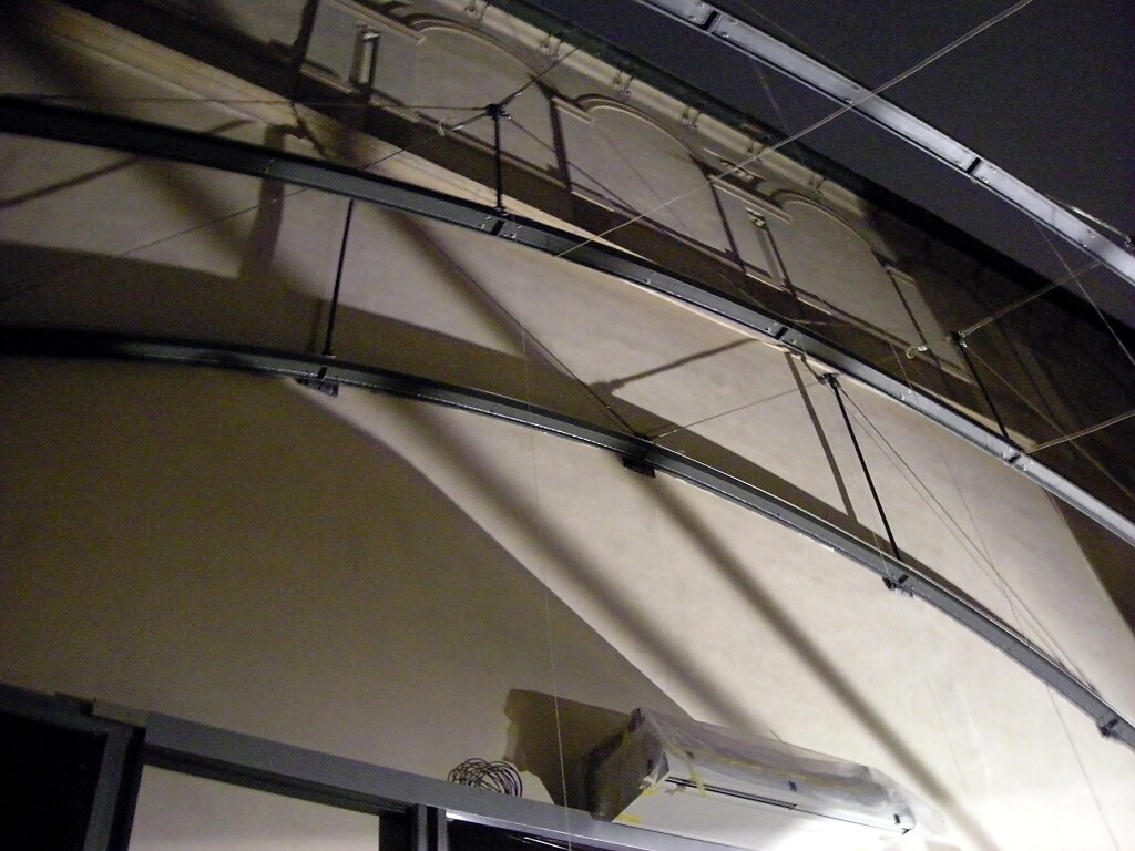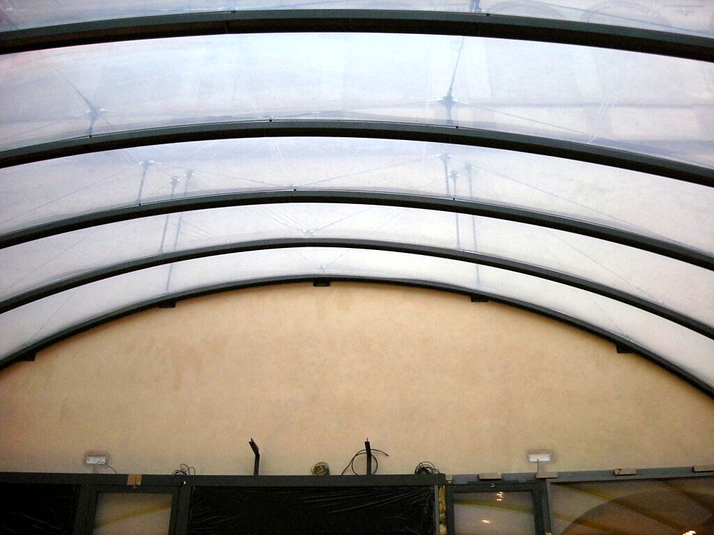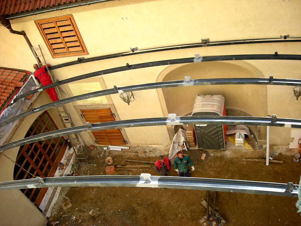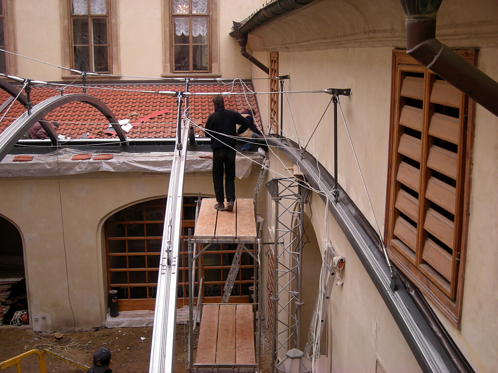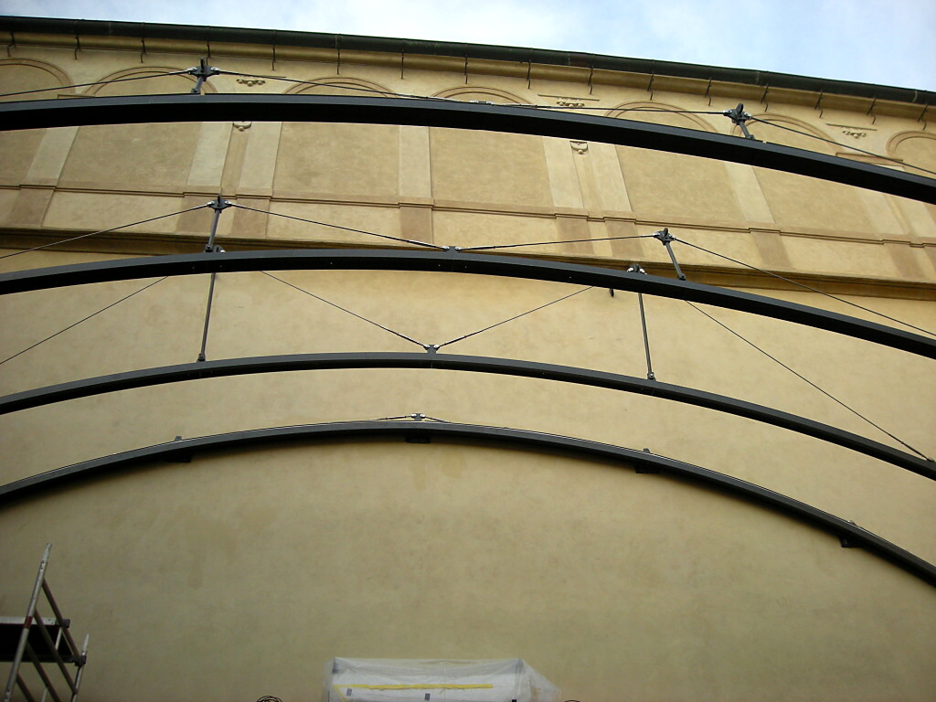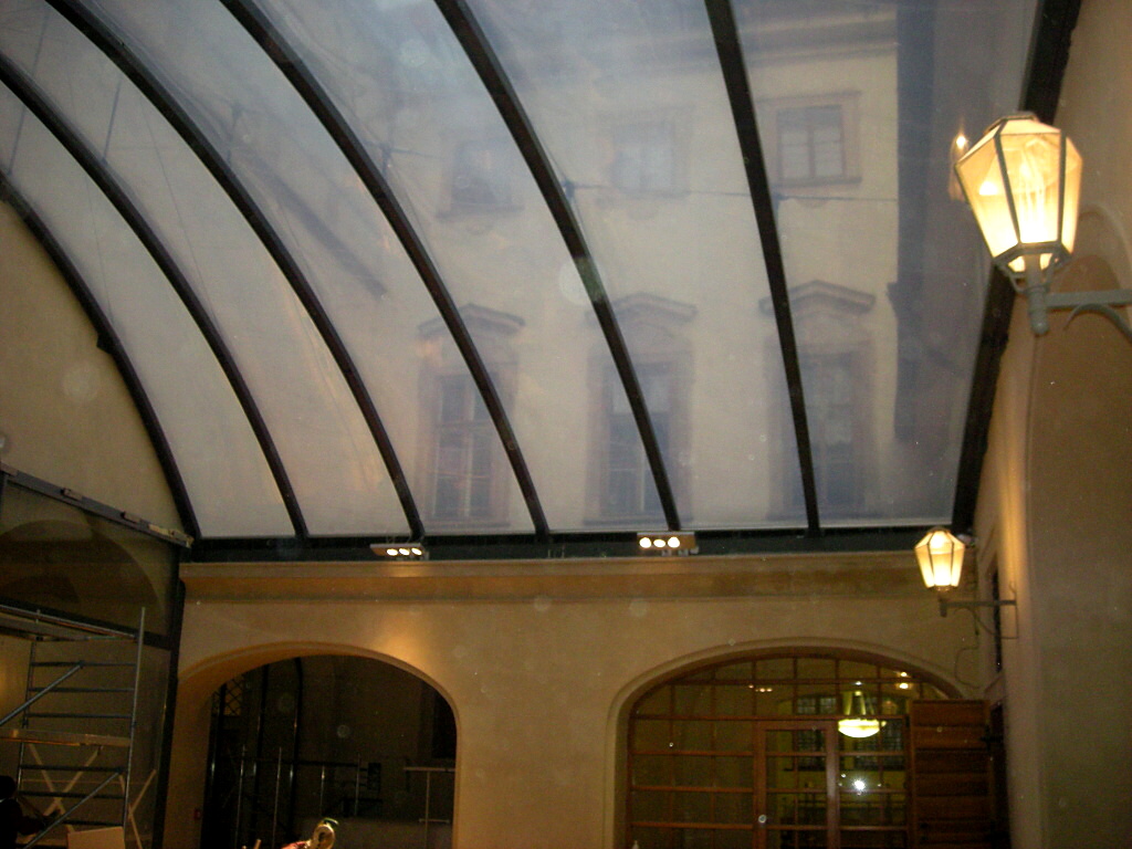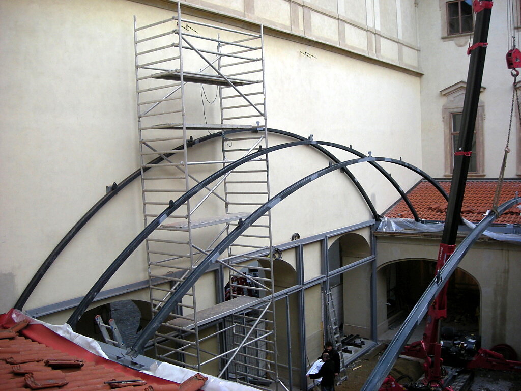 Nad obdélníkovým půdorysem dvora Nosticova paláce je umístěno celkem sedm obloukových nosníků, jejichž vzepětí se zvyšuje od nejnižšího oblouku konstantním přírůstkem. Krajní obloukové nosníky jsou fixovány do přilehlých stěn ve vodorovném směru. Obloukové nosníky jsou ze svařovaných H profilů výšky 80mm a šířky 130mm, z plechu tloušťky 10mm. Tyto nosníky jsou uloženy na pozednicové obdélníkové profily 200x150mm z plechu tloušťky 10mm, které jsou kotveny do zdiva vždy ve třech místech. Na krajích jsou profily zataženy do příčných stěn a uprostřed jsou kotveny v místě vnitřní příčné stěny. Kotvení je realizováno smykovou zarážkou z plechu a vlepenými kotevními šrouby. Kotevní prvek je zabetonován do vybourané kapsy po úroveň vodorovné desky. Obloukové nosníky jsou vyvěšeny každý v pěti místech ze dvou podélných nosných lanek, které jsou kotveny do příčných stěn svorníky. Vyvěšení v místech svisle pod hlavními lanky je provedeno z trubek. Šikmé vyvěšení vně hlavních lanek a uvnitř uprostřed nosníků, kde se závěsy z obou hlavních lanek stýkají, je provedeno také lanky. Připojení všech závěsů na obloukové nosné profily je provedeno svislými styčníkovými plechy, umístěnými podélně na obloukové profily.