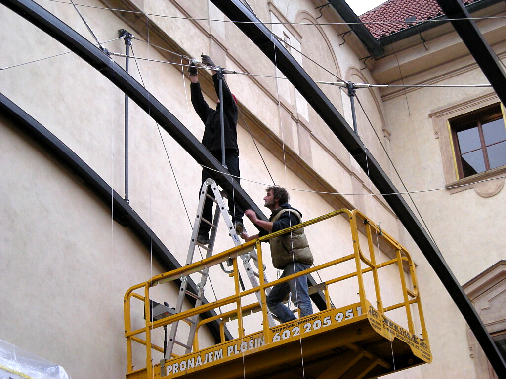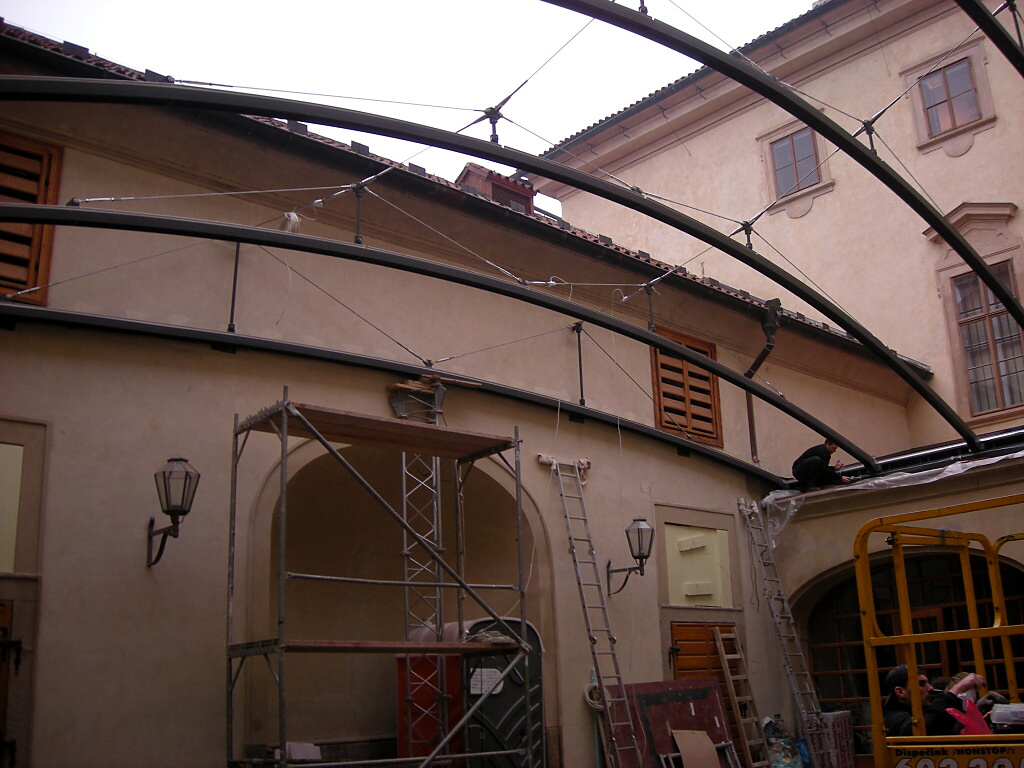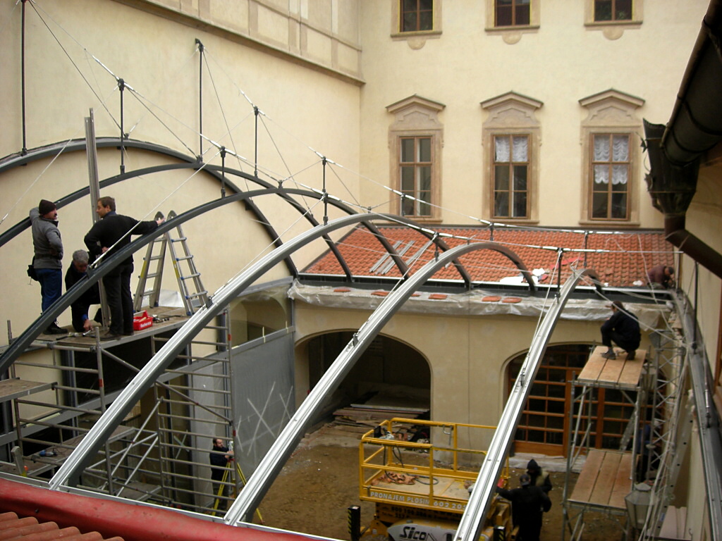 Předepnutá ocelová konstrukce pro zastřešení dvora Nosticova paláce přetlakovou ETFE folií.