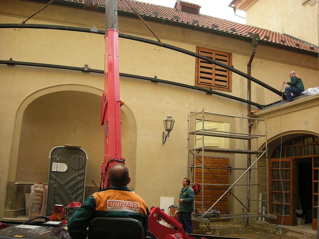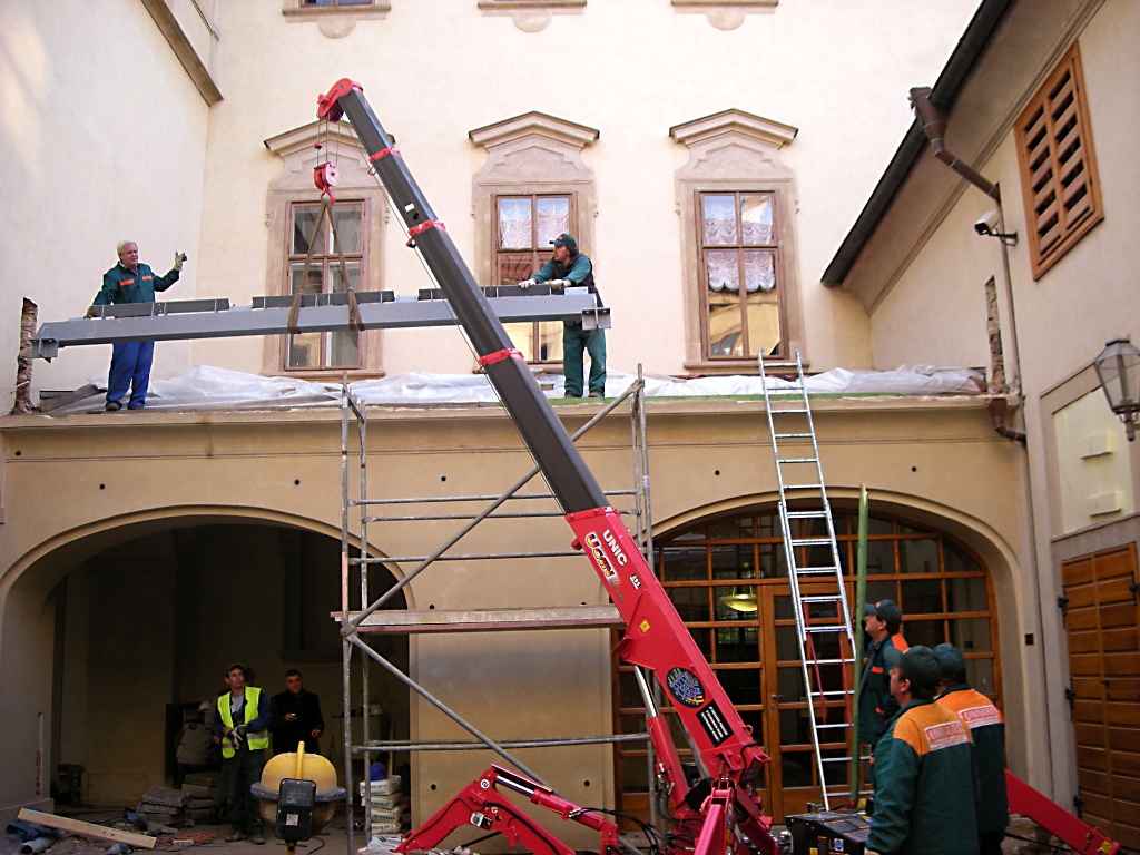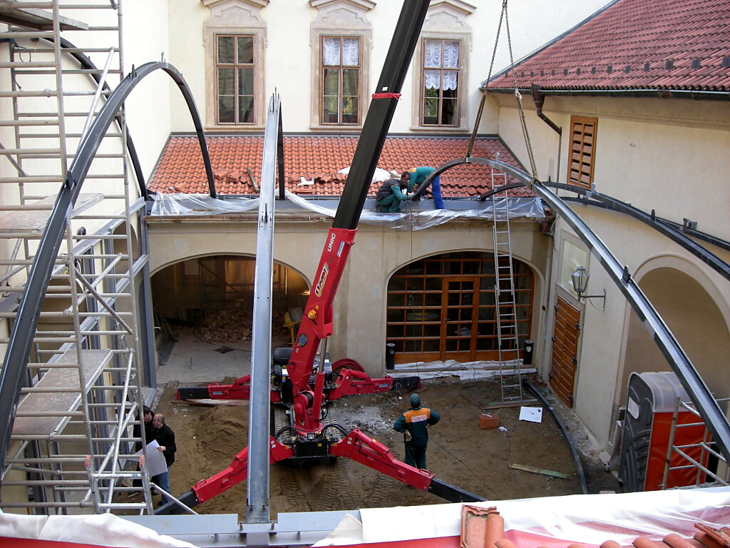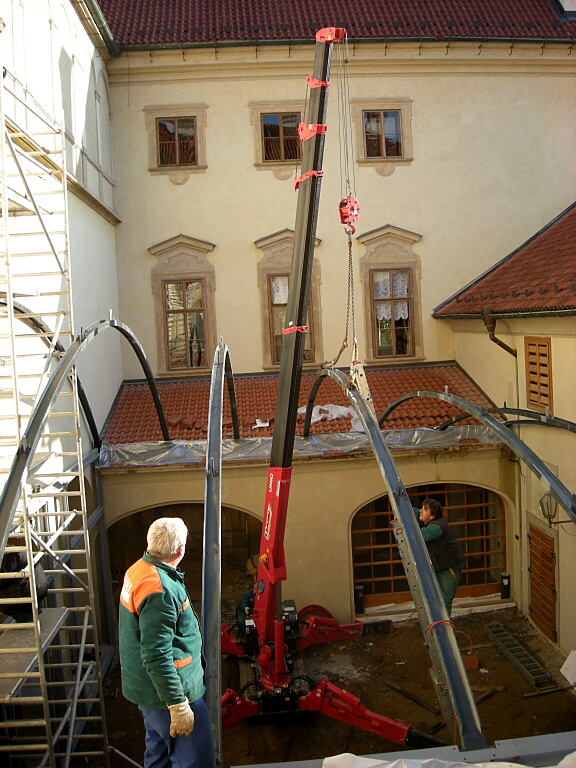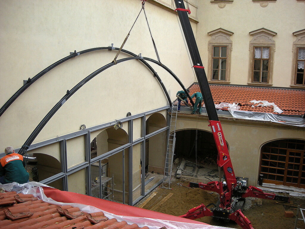 Pro montáž nosné ocelové konstrukce byly využity pásové mini jeřáby UNIC URW 295 a UNIC URW 506, které byly vhodné pro omezený manipulační prostor dvora.